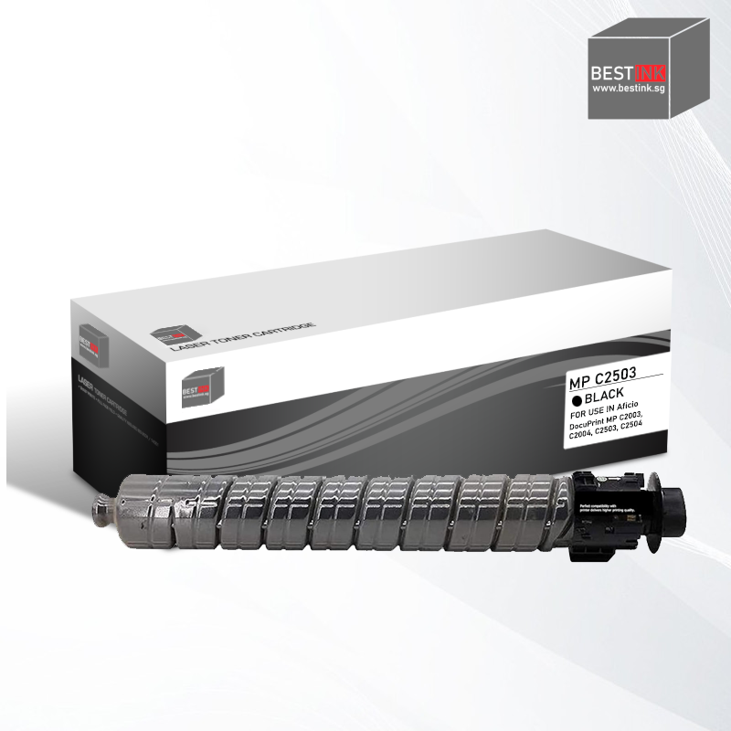 Brand: Bestink Compatible Printers: MP C2003, MP C2004, MP C2503, MP C2504 Print Yield: MPC2503BK: 15000 pages MPC2503C: 9000 pages MPC2503M: 9000 pages MPC2503Y: 9000 pages